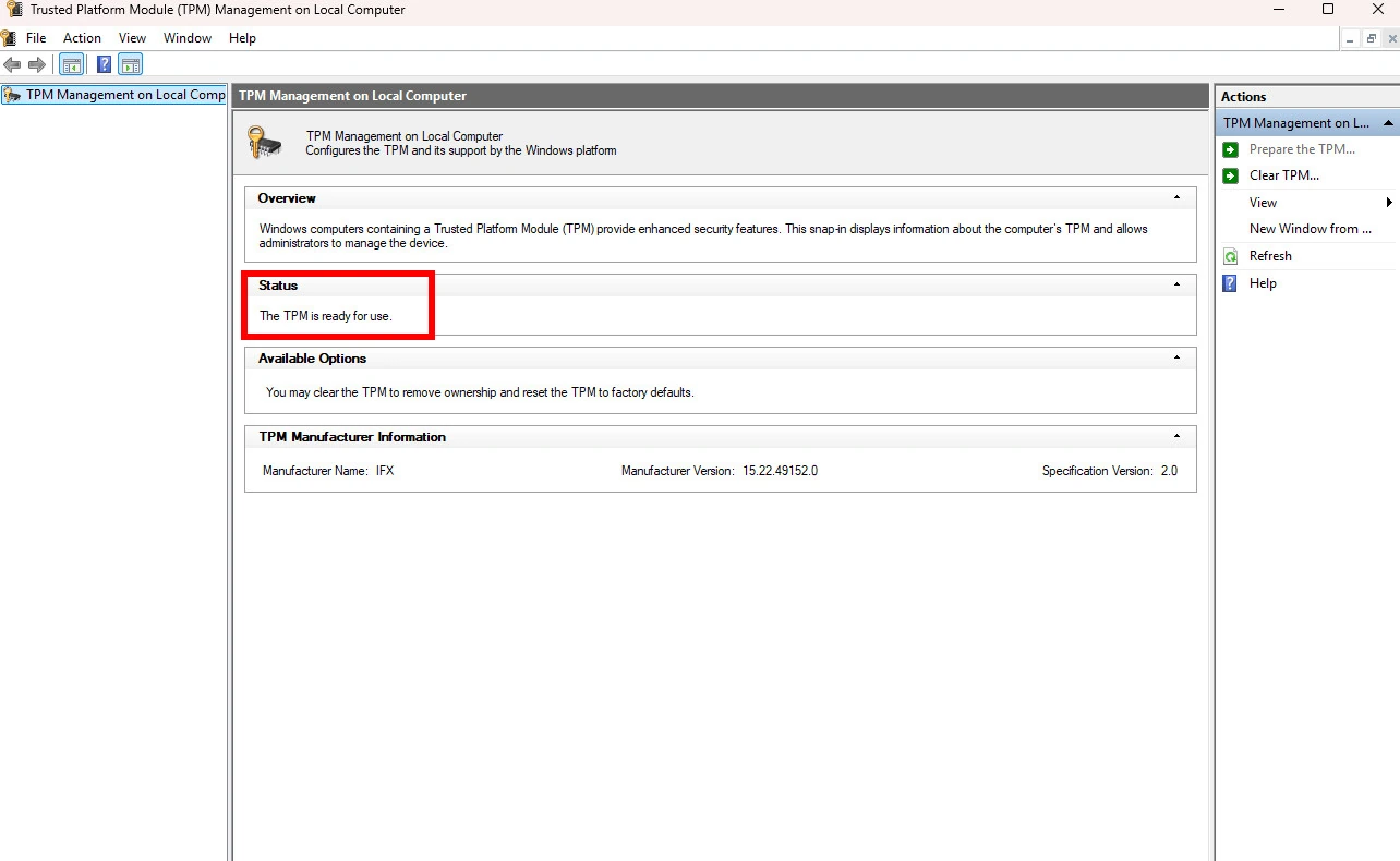 y presiona Enter. - En la ventana que aparece, verifica que en la sección Estado se lea “El TPM está listo para usarse” o “The TPM is ready for use”.