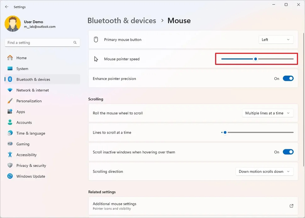 - Utiliza el control deslizante de Velocidad del puntero del mouse para aumentar o reducir la velocidad según tu preferencia.