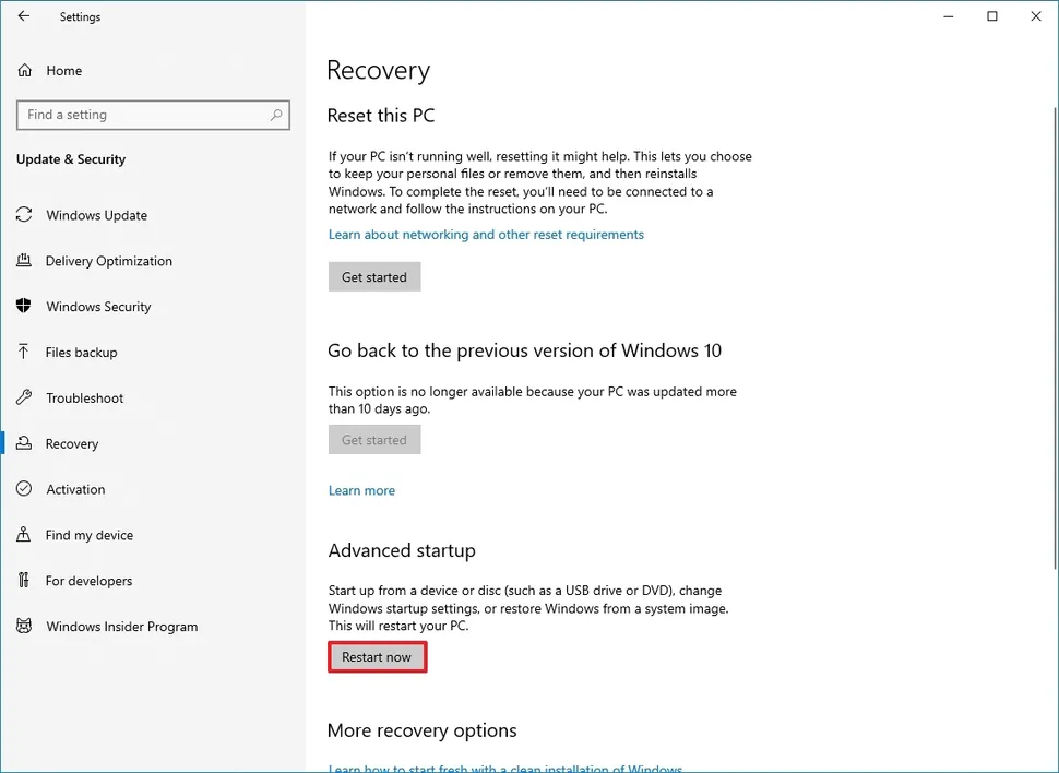 - En la sección Inicio avanzado, haz clic en Reiniciar ahora.