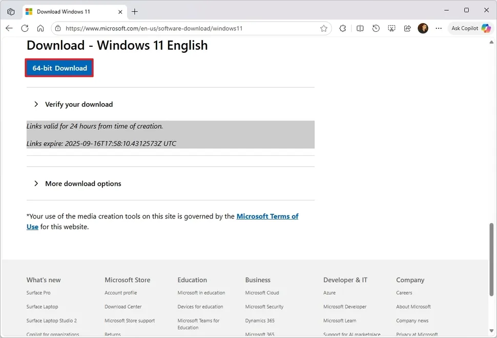 - Haz clic en el botón Descargar de 64 bits para guardar el archivo ISO en tu computadora.