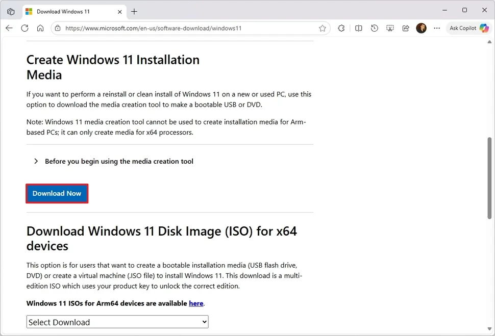 - Haz clic en el botón Descargar ahora en la sección “Crear medios de instalación de Windows 11”.