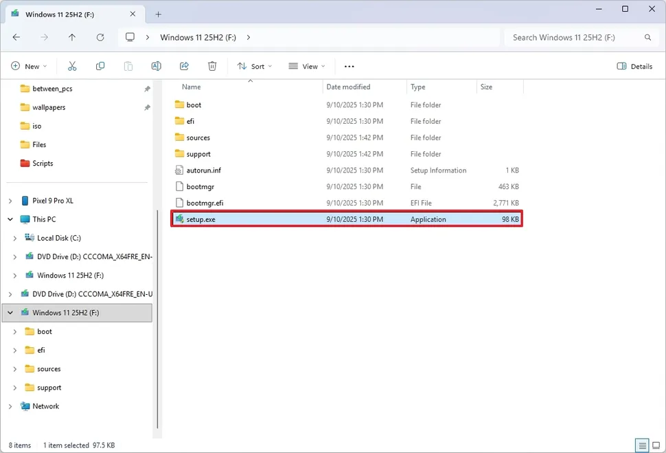 - Abre la unidad USB creada con la Herramienta de creación de medios.