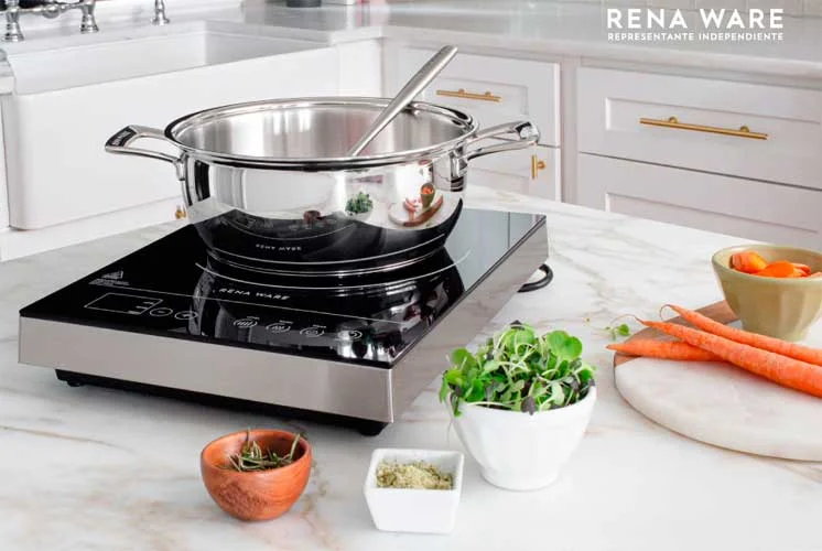 ¿Con qué utensilios funciona la IC-450? Con acero inoxidable magnético, hierro fundido y utensilios con símbolo de inducción; evita aluminio y acero no magnético. La manera más fácil para saberlo: revisa que las olals abajo tengan el grabado «Compatible con Inducción»