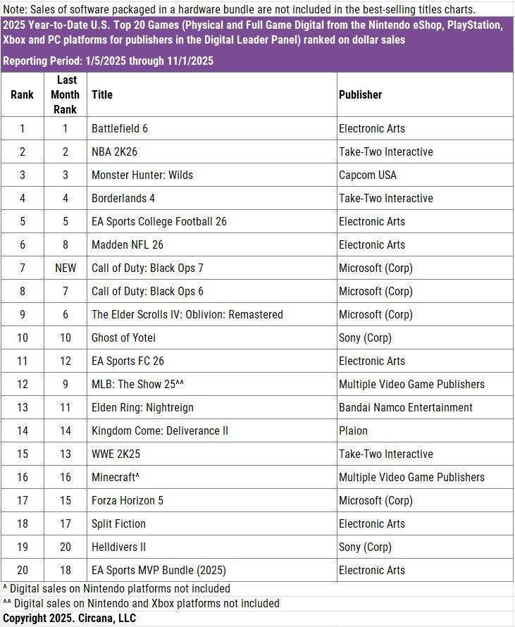 En cuanto al software, noviembre dejó una curiosa lectura competitiva. Call of Duty: Black Ops 7 fue el videojuego más vendido del mes en Estados Unidos, pero no logró entrar en el top cinco de ventas acumuladas del año.