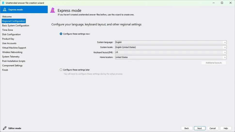 • Creación de archivos desatendidos: la herramienta ofrece un asistente para generar el archivo autounattend.xml, que automatiza el proceso de instalación de Windows 11.