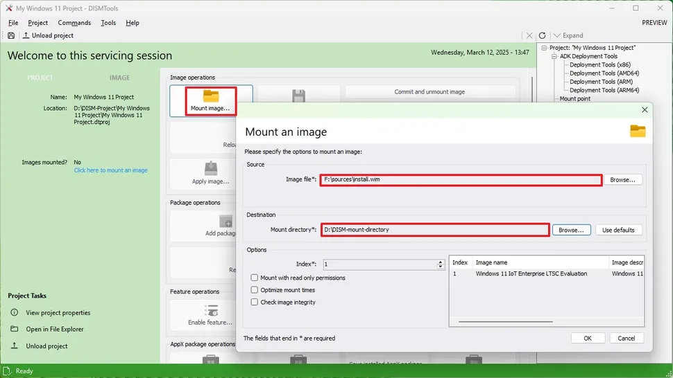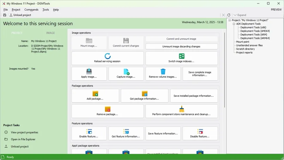 DISMTools se distingue por ofrecer un enfoque basado en proyectos, lo que permite gestionar imágenes montadas, crear archivos de respuestas desatendidas, convertir imágenes y mucho más, optimizando así el flujo de trabajo frente al uso directo de DISM en la terminal.